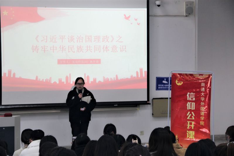 本次信仰公开课分为“筑牢民族共同体意识”“释放民族多样化活力”“谱写民族团结主旋律”三个篇章,由英语师范202班谭杨璐主持。在第一篇章里,同学们就《习近平谈治国理政》(第三卷)英文版中有关民族共同体意识内容进行了学习分享。在第二篇章里,英语师范201班沈馨、英语师范201班沈芯茹分别讲述了长征路上“彝海结盟”的民族故事以及六盘山下的民族团结印记,以此加强大学生的民族认同感,铸牢大学生的中华民族共同体意识。第三篇章里,学院少数民族学生代表日语202班吕皓佳、英语师范201班保鑫婕分别从民族历史、民族建筑、民族节日、饮食文化等方面介绍了蒙古族以及回族民族风情,使现场的同学们更深刻地了解我国的少数民族。随后,学院党委副书记、副院长陈俊怀带领大家一同学习了党的十九届六中全会公报,要求大家学深悟透会议精神,从党的百年奋斗重大成就和历史经验中汲取奋进力量。信仰公开课在大合唱《爱我中华》中落下了帷幕。