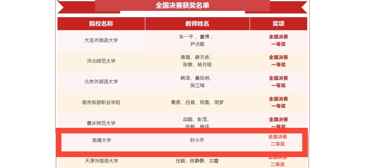7月25日,2023“外研社杯” 全国高校日语课程思政教学设计大赛(日语专业组)评审结果公布,成人小说 教师封小芹的参赛作品获得全国决赛二等奖。