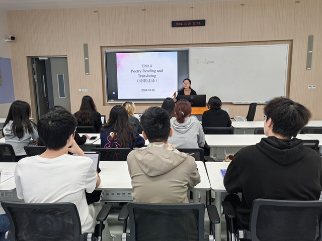 10月25日,翻译系朱丹老师为学院教师示范《英语读译》课程教学。以济慈的《秋颂》为例,朱丹老师引导学生关注诗歌的节奏与韵律,深入讲解创作特点与翻译策略。同时,朱老师将课程思政元素与教学内容有机融合,培养学生对诗歌的热爱之情,实现“润物无声”的育人佳效。