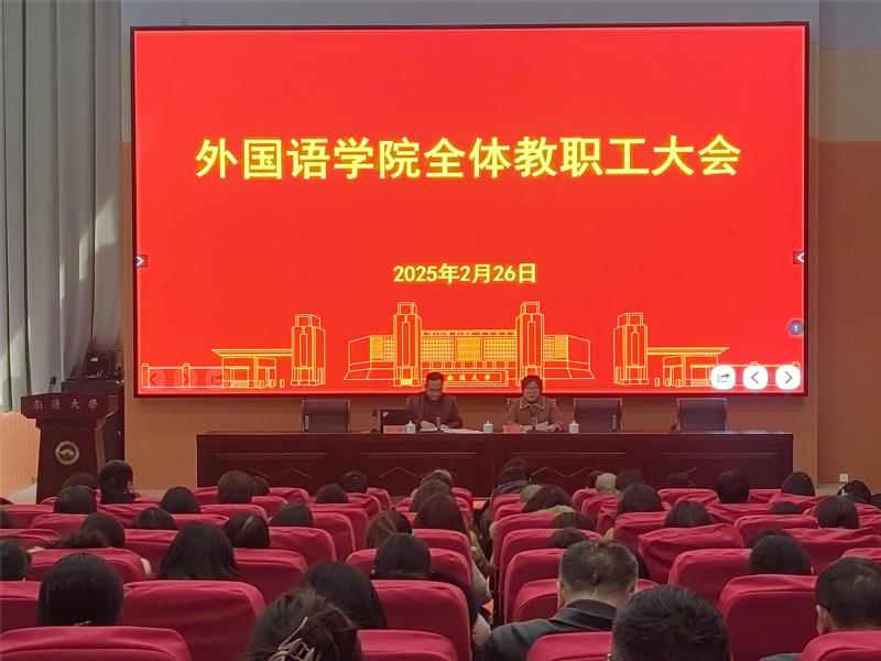 会上,学院党委书记朱小娟传达了学校“两代会”精神,领学了杨宇民书记所作的《干字当头奋发有为努力谱写特色鲜明的国内一流大学建设新篇章》工作报告,以及题为《保持战略定力深化改革创新加快推进特色鲜明的国内一流大学建设》的讲话。朱小娟结合学院现阶段发展形势,对全体教职工提出四点要求:一是要深入学习,凝聚共识。深入学习“两代会” 精神,结合学院实际转化为具体行动,以更高站位和责任感推动学院发展。二是要聚焦主业,提升质效。坚持立德树人根本任务,全面提升教书育人质效,深耕科研工作,助力学科建设。三是要服务大局,彰显担当。将个人发展与学校、学院目标紧密结合,发挥外语学科的特色优势,积极参与各项活动。四是要团结协作,共谋发展。她表示,学院党委将继续坚持“围绕中心抓党建,抓好党建促发展”的理念,发挥党建引领作用,凝聚力量,推动学院在教学、科研、国际化等方面取得新突破。