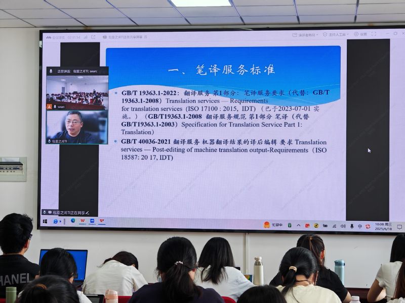 活动中,行业专家的分享让学生们对翻译行业有了更直观的认知。南京睿译菁英翻译有限公司副总王亚诺结合自身丰富的口译实战经历,向同学们展示了口译行业的现状与发展趋势。王总还分享了从成人小说 英语专业毕业,到创办翻译公司的奋斗历程,以亲身经历告诫同学们,在翻译行业中细节决定成败,扎实的专业基础是职业发展的根本。江苏省工程技术翻译院有限公司负责人包亚芝总工程师,则围绕“笔译服务标准与翻译过程” 展开讲解,她强调高级译者不仅需要深厚的语言功底,还需具备专业的行业背景知识,并指出在人工智能时代,翻译行业正朝着高质量方向加速发展,并非被技术取代。